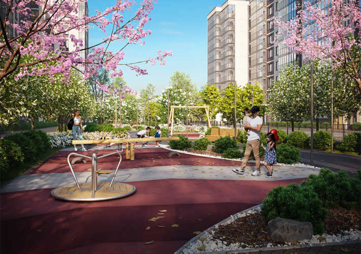 Для приверженцев активного образа жизни установлены велопарковки. Детская инфраструктура представлена игровыми площадками с безопасным антитравматическим покрытием и веревочной пирамидой. Спортивная зона оснащена тренажерами street workout, турниками, столом для настольного тенниса и стеной для скалолазания.