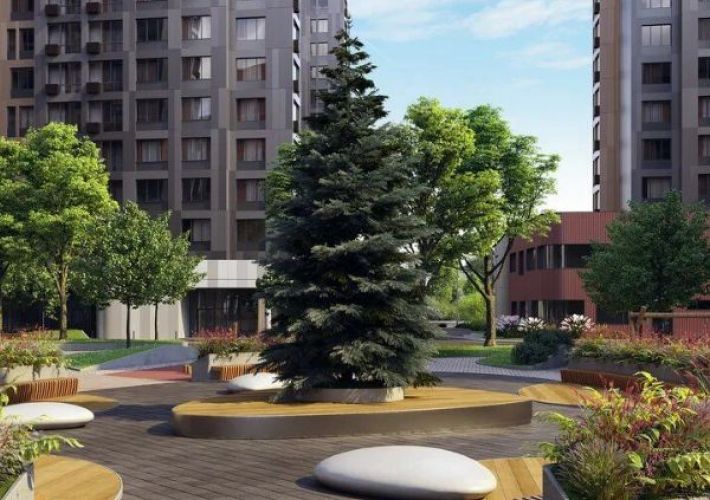 На внутренней территории создается природный ландшафтный двор с архитектурными формами и подсветкой, деревянными настилами для йоги и медитации, деревянным амфитеатром, зелёными насаждениями. Центр квартала займет общественная площадь, где зимой будут устанавливать новогоднюю елку.