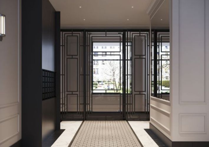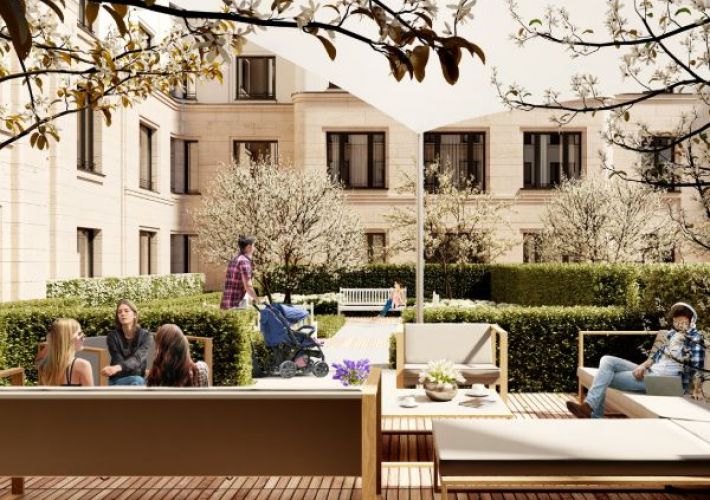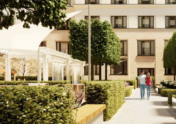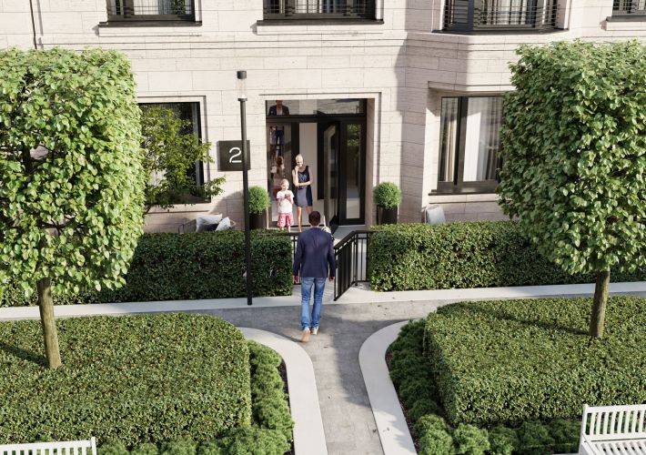 Закрытая охраняемая территория с детскими площадками на безопасном покрытии и зонами отдыха. Вход во двор проходит через колоннаду. Организованы тротуары, проведено озеленение территории. Для владельцев личного транспорта предусмотрен подземный паркинг, а также места на отдельных наземных стоянках. Входные группы выполнены со светопрозрачными дверями, в квартиры на первом этаже организованы отдельные входы. Для безопасности жильцов установлены камеры видеонаблюдения.