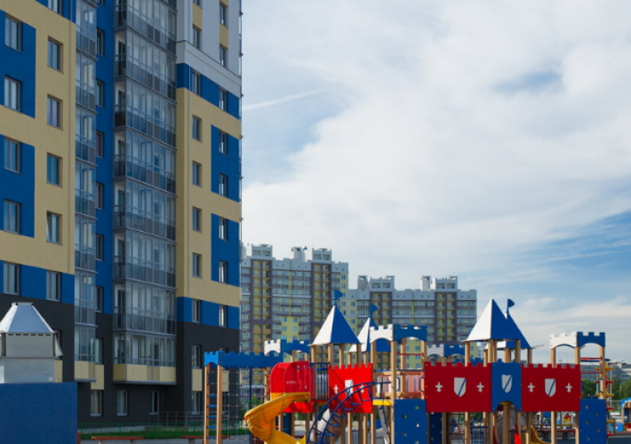 Закрытий двор, детские и спортивные площадки с прорезиненным покрытием, зона для ворк-аута, спортивный корт, где можно кататься на коньках или играть в футбол в зависимости от сезона.
