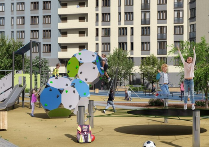 Концепция благоустройства продолжает тему Универсиады: тематика в оформлении дворов и холлов — континенты. Сквозные подъезды застройщик организует на уровне земли. Интерьер лобби украсят плитка из керамогранита, художественные панно, декоративное освещение.