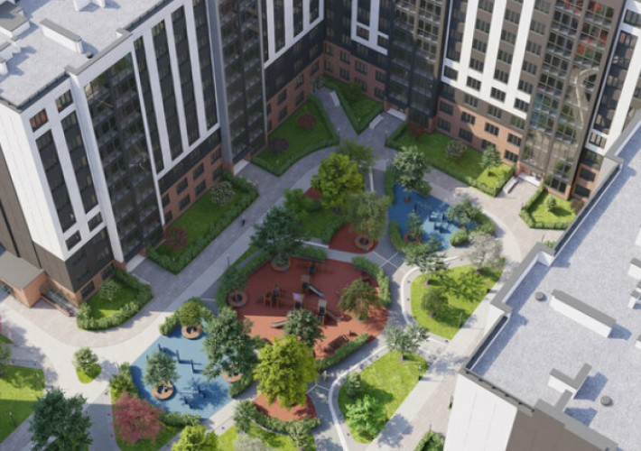 По всей территории комплекса будут высажены декоративные кустарники и деревья, установлены лавочки и придомовое освещение.