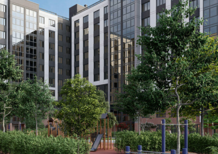 Во дворе дома будет осуществлено благоустройство зонами отдыха: по всей территории будет проходить прогулочная зона, для детей установлено несколько детских игровых площадок, а также возведены спортивные площадки.