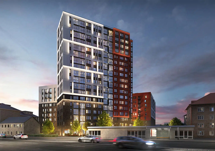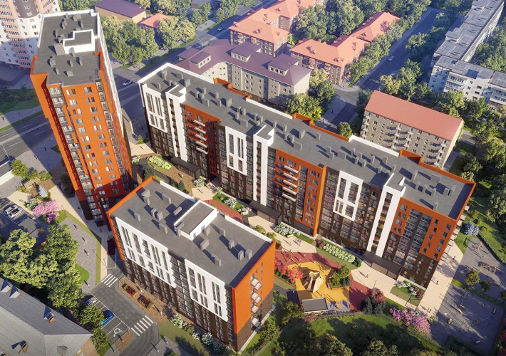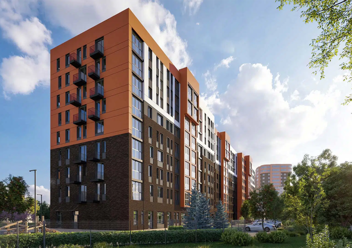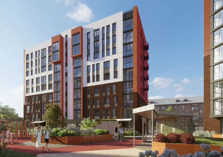 Здания возводятся по монолитно-каркасной технологии, гарантирующей долговечность и надежность. Фасадная отделка выполнена из комбинации материалов: цементной плитки, декоративной штукатурки и крупноформатных HPL-панелей. Нижние этажи облицованы бетонной плиткой LongBrick, имитирующей кирпичную кладку. Визуальная динамика фасада создается с помощью выступающих элементов и ниш под оконными проемами.