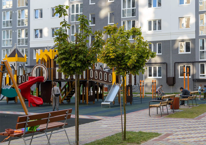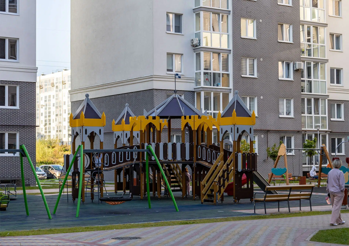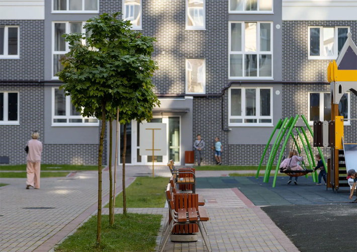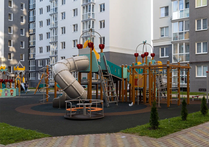 Территория комплекса оборудована всем необходимым для комфортного проживания. Здесь имеется гостевая парковка, рассчитанная на 29 машино-мест, организованы удобные пешеходные зоны, места для отдыха, детские игровые и спортивные площадки. Территория благоустроена декоративными кустарниками и деревьями. Также предусмотрена специальная зона для твёрдых бытовых отходов и установлено качественное придомовое освещение.