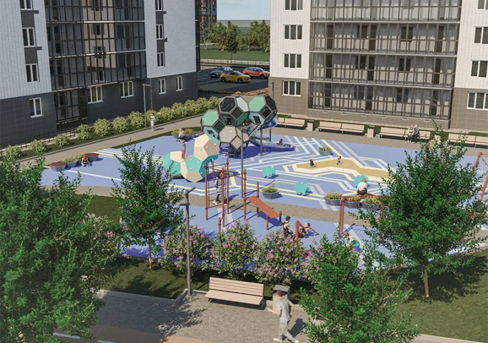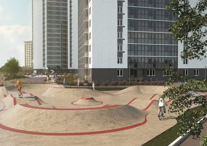 - На территории комплекса расположены современные, безопасные детские спортивные площадки и построен уникальный СКЕЙТ-ПАРК.