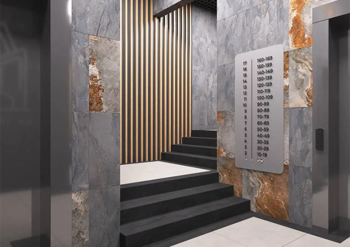 - Улучшенная отделка парадного входа и лифтового холла первого этажа итальянским керамогранитом светлых тонов по дизайн-проекту. Входные группы выполняются из противоударного стекла для максимальной освещенности внутреннего пространства естественным светом.