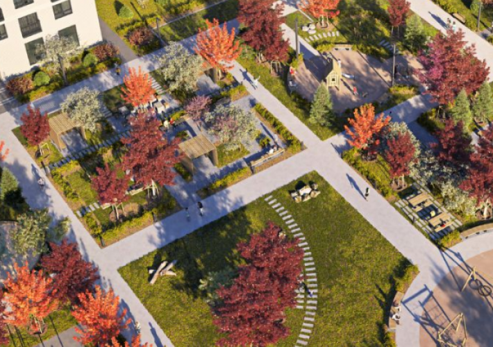 Это небольшой и уютный проект, в котором всего 8 жилых домов с переменной этажностью — 12, 24 и 32 этажа, подземный паркинг, детский сад и начальная школа. Внутри квартала появится собственный приватный парк с Wi-Fi и зарядками, где можно работать, гулять, играть на детских и спортивных площадках. На первых этажах откроются магазины, кафе и другие сервисы.