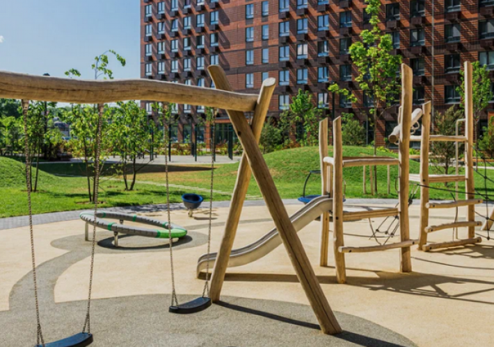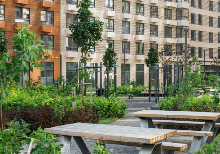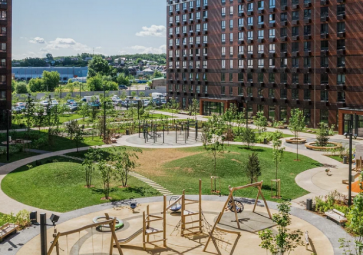 Расположение зданий образует внутренние дворы, которые закрыты от автомобилей и прохожих. На территории расположится небольшой парк с ландшафтным озеленением и функциональными зонами. Здесь можно будет прогуляться среди живых деревьев и кустарников, посетить детскую площадку с безопасным покрытием, заняться спортом на уличных тренажерах. В проекте предусмотрена медленная зона для электросамокатов.