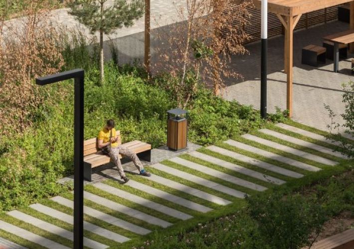 Места для отдыха и детских игр сделаны из натурального дерева: зимой они не промерзают, а летом не накаляются от жары. Безопасность во дворе контролируют камеры видеонаблюдения и охрана. Во дворе высажено 40 видов растений: уже взрослые высокие деревья - липы, березы, яблони, ели, кустарники - сирень, дикая роза, горная сосна, кизильник, цветы и злаковые травы. Между зонами активности и в центре двора уложен газон. Растения отличаются по высоте и плотности, цветут в разное время года, чтобы двор всегда выглядел разнообразным.
