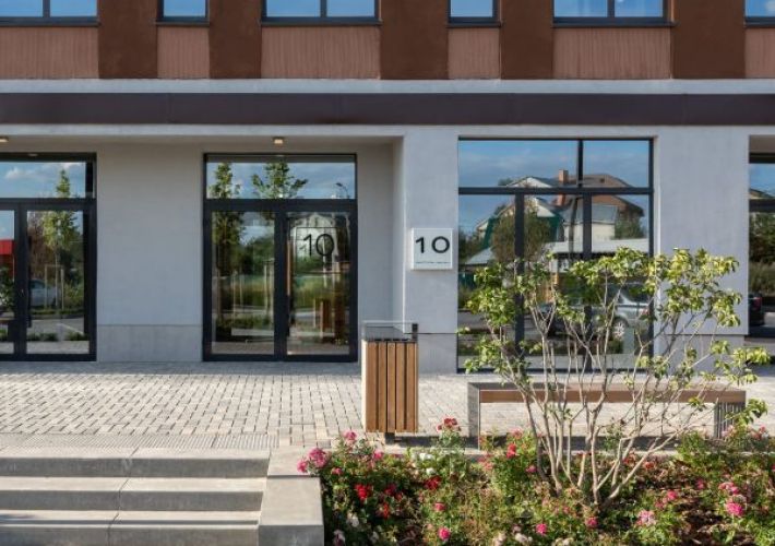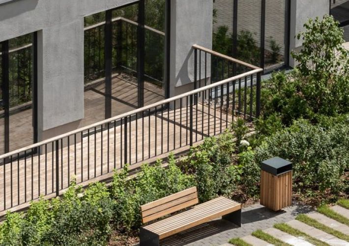 У квартир на первых этажах есть террасы - небольшие огороженные участки с террасной доской. Террасы отделяют квартиру от пространства двора с помощью небольшой изгороди и кустарников. Здесь можно обустроить место отдыха, поставить качели, разместить гамак или детскую зону. Благодаря террасе в квартире сделаны окна в пол: прилегающая комната - спальня или кухня - гостиная, наполнена светом. Выход на террасу устроен из квартиры. Террасы придают квартирам загородный характер проживания. Это приусадебный участок, который позволяет проводить время на свежем воздухе, оставаясь в пространстве своего жилья.