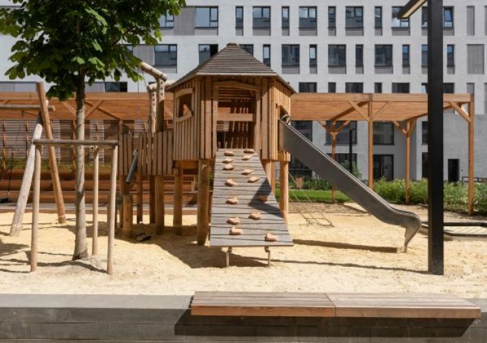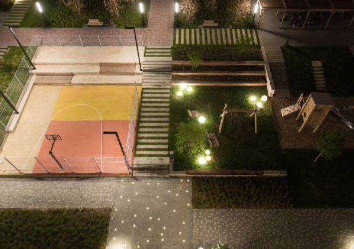 Двор закрыт от машин и предназначен для жителей. Доступ на территории ограничен магнитным ключом. Двор устроен как зелёный парк с разнообразными функциями - для детей, спорта и отдыха. Обустроен большой спортивный корт для игры в баскетбол с мягким покрытием. Рядом расположены уличные тренажёры. На детской площадке, оборудованной игровыми модулями, есть лазалки, скалодром, качели, лабиринты, пружинки, батут и песочница. Для спокойного отдыха предусмотрены беседки - перголы.