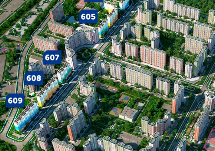 Строительством и реализацией корпусов занимается ДСК - 1. Застройка ведётся домами индустриальной серии П - 44К. Квартиры с полной или чистовой отделкой.