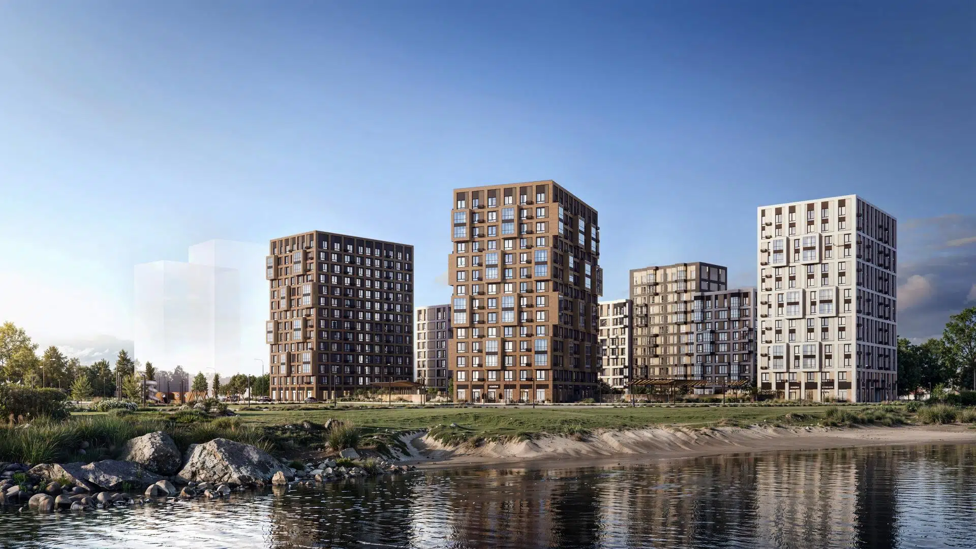 Корпуса высотой 9-12 этажей и 14-17-этажные башни украшают деревянные панели. На входе в подъезды не будет ступеней и высоких порогов. После прогулки велосипеды и коляски можно оставить в местах хранения.