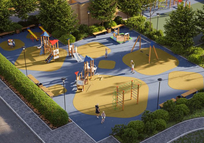 В каждом дворе — современные детские площадки из природного материала для детей разного возраста, уличные тренажеры, а также безопасные велодорожки.