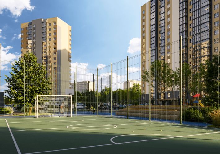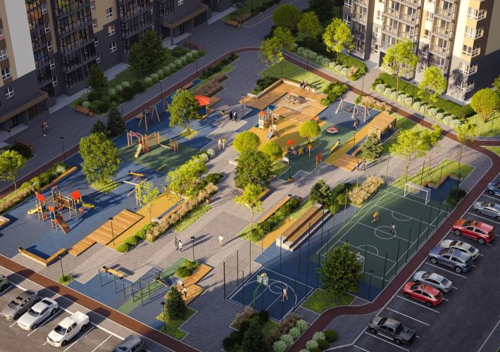 В проектировании дворов учтены самые разные варианты детского отдыха и игр, а том числе спортивные площадки.