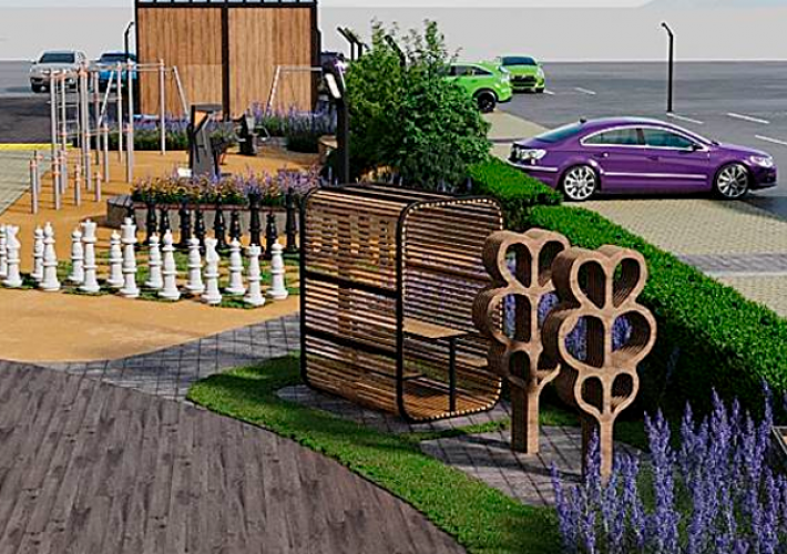 На просторной территории разместятся безопасные площадки для детей разных возрастов, уличные тренажеры, зона для занятий йогой с деревянным настилом, большая шахматная доска, места отдыха с беседками и скамейками.