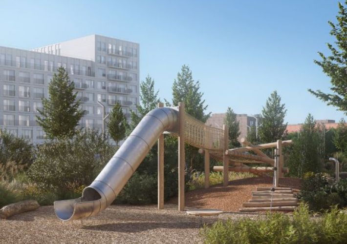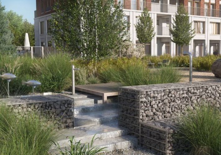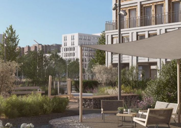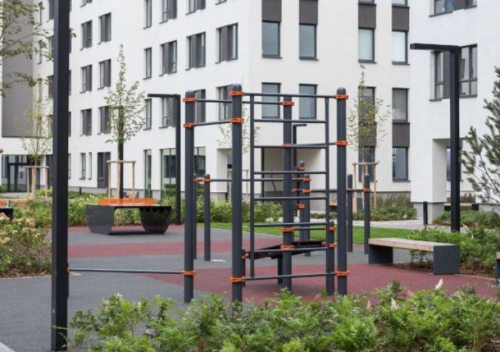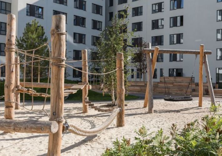 Полуприватные дворовые территории ЖК закрыты от проезда машин и окружены живыми изгородями. Благоустройство периметра включает организацию детских игровых зон, спортивных площадок и мест отдыха со скамейками и беседками-перголами. Парковочные места запроектированы с внешней стороны домов.