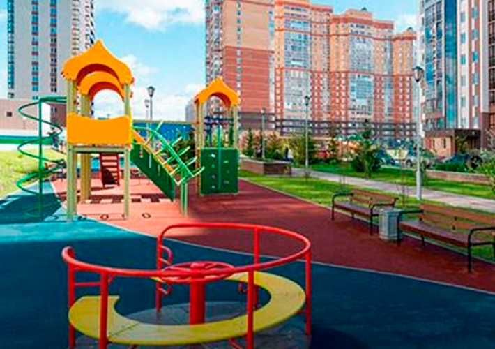 Дворы освобождены от проезда машин. Благоустройство включает детские и спортивные площадки, беговые и велодорожки, места отдыха и прогулочные аллеи.