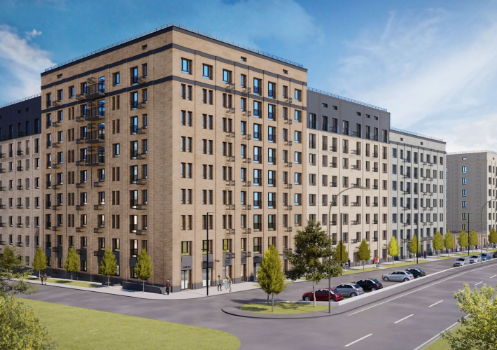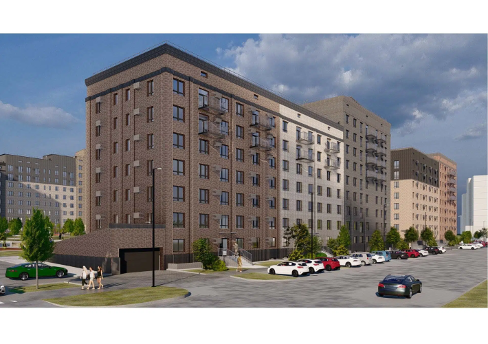 Первые этажи высокие и оформлены прозрачным панорамным остеклением со стороны улицы. Дома не выглядят монолитными и тяжеловесными. Открытые балконы и разная этажность задают динамику.