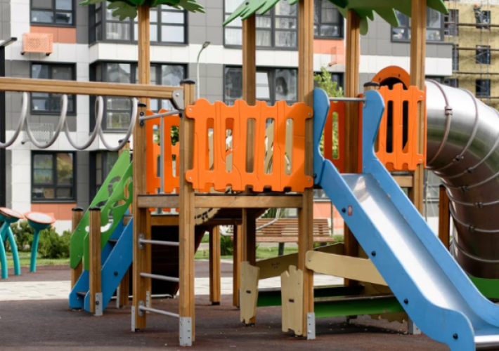 - Большое количество детских площадок с безопасным покрытием;