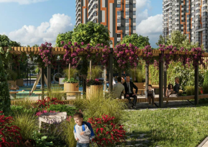 Огороженная придомовая территория. На ней реализована концепция «двор без машин» и создана безбарьерная среда для маломобильных граждан. Также спроектированы три детские площадки с горками, качелями, песочницами, скалодромом и так далее.