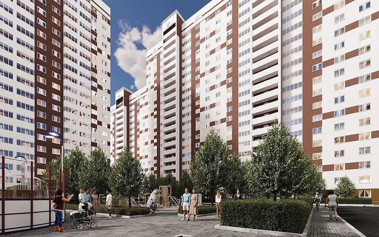 Территория комплекса будет полностью облагорожена: запланировано создание внутридворовых проездов, пешеходных дорожек и тротуаров, озеленение территории газонами, деревьями и кустарниками. Для юных жителей предусмотрены игровые зоны, а для спортивных активностей — специализированные площадки. Проект также включает уютные зоны отдыха.