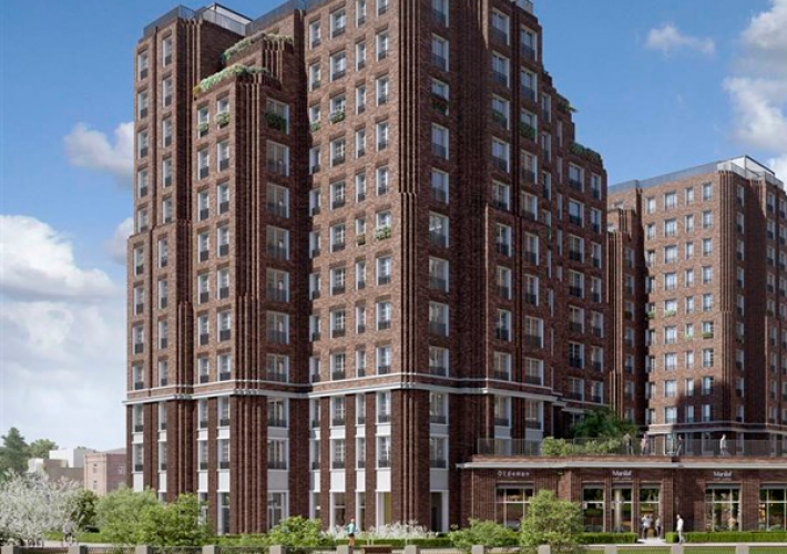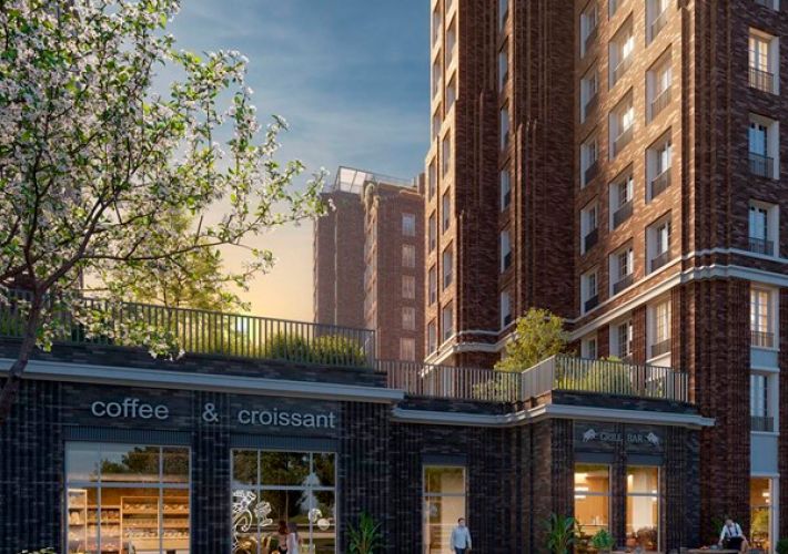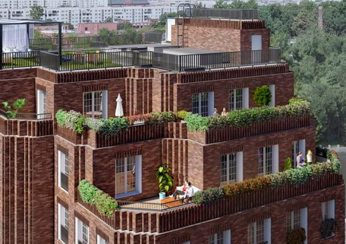 Облик жилого комплекса выполнен в стилистике американского ар-деко. Для отделки фасадов выбран декоративный клинкерный кирпич благородного тёмного оттенка, который контрастирует со светлым бетоном соседних зданий.
