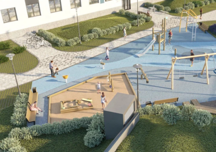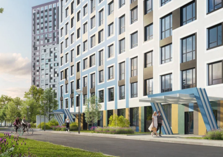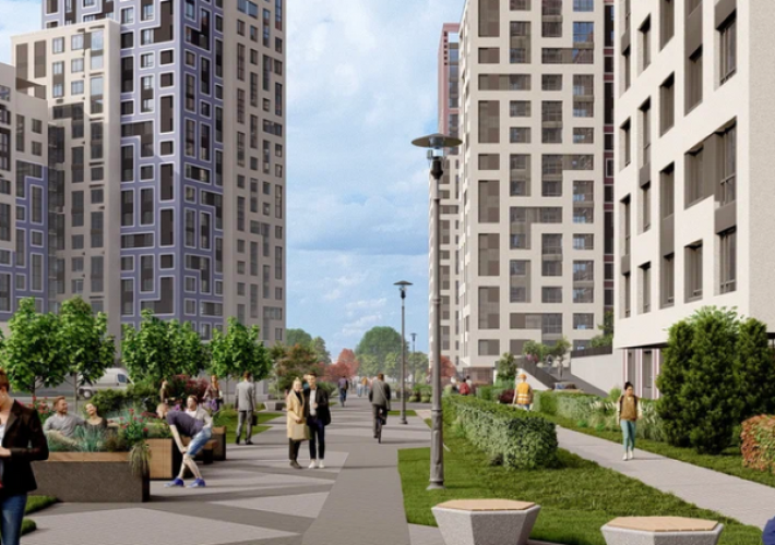 Концепция благоустройства включает создание парка, строительство детских игровых площадок, мест отдыха и прогулочных зон. На первом этаже коммерческие помещения.