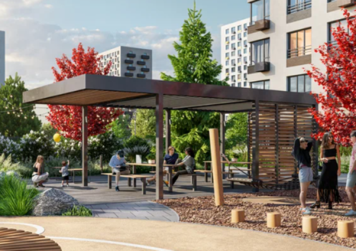 Внутренний двор ЖК закрыт от машин и напоминает уютное пространство с детскими площадками, а также с местами для отдыха. На площадках есть зоны для детей разных возрастов. На площадках используется оборудование из натуральных материалов и ландшафтные формы ‒ например валуны и брёвна. Безопасное покрытие защитит ребёнка от травм во время игры. Площадка для уличных тренировок появится во дворе. Здесь будут установлены турники, брусья, ступени для кроссфита и скамьи для пресса. а площадках не будет скользко благодаря покрытию из резиновой крошки. На территории проекта также предусмотрены велодорожки, парковки для самокатов и велосипедов.