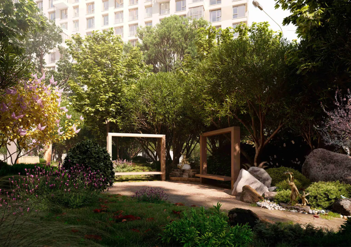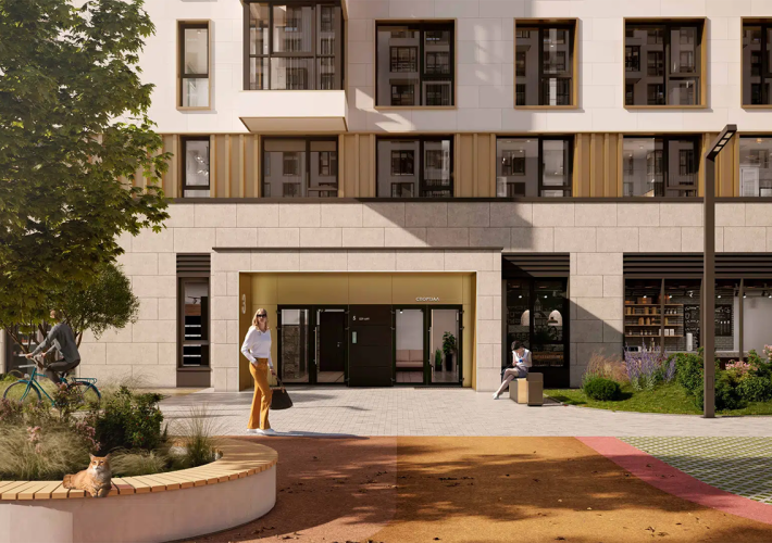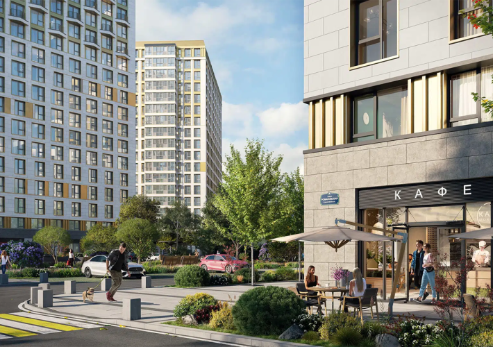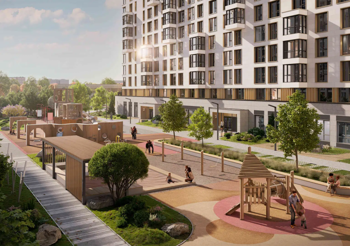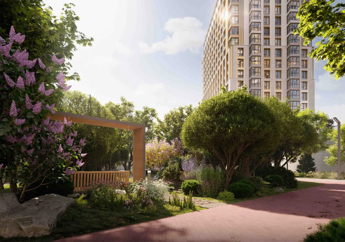 Дворовая территория оборудована детскими площадками с разделением по возрастным категориям и спортивной зоной воркаут с безопасным тренировочным оборудованием. Территория благоустроена зелеными насаждениями, включающими взрослые деревья и кустарники, украшена арт-объектами, оснащена пешеходным бульваром и садом для поддержания ментального здоровья.