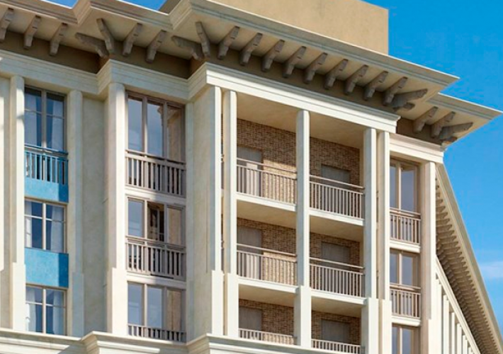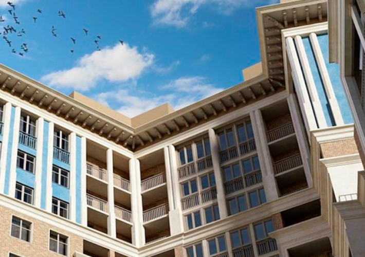 Комплекс состоит из трех 6-12-этажных корпусов.Цветовая гамма фасадов выдержана в светлых тонах.