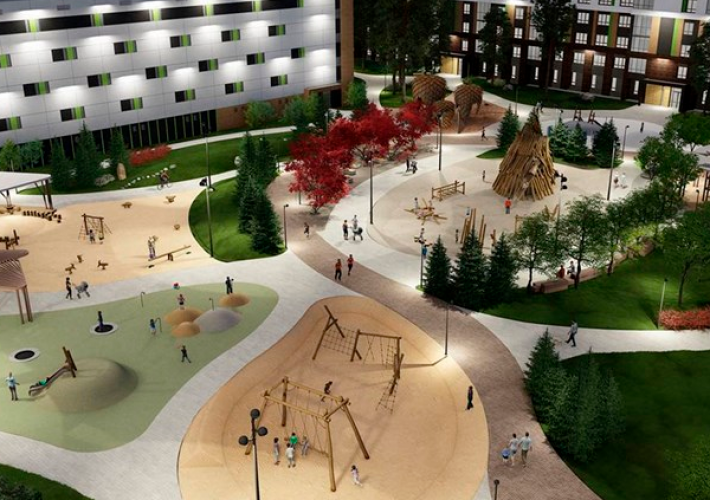 Благоустройство комплекса будет сочетать все необходимые элементы для каждого жителя: интересные детские площадки, прогулочные маршруты, спортивные площадки и оборудование. Для старшего поколения – спокойная зона отдыха.