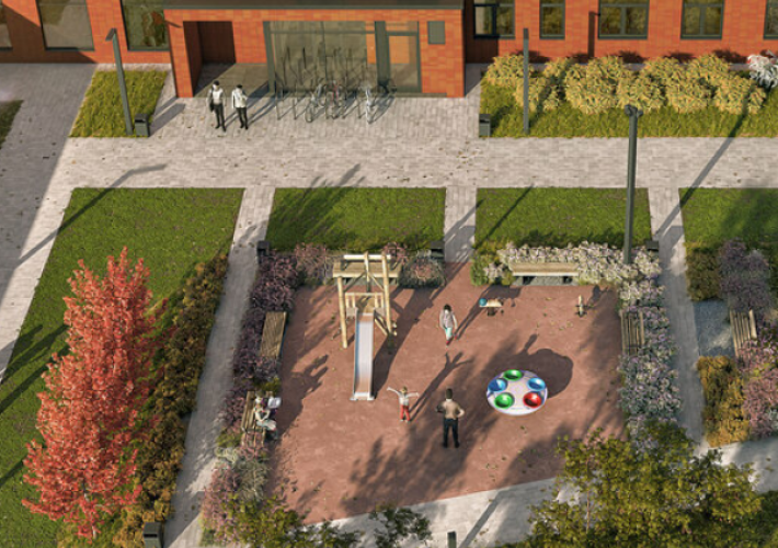В зелёных дворах-парках будут оборудованы современные детские и спортивные площадки, обустроены места для отдыха. На первых этажах разместятся магазины, кафе и другие сервисы. Дворы сделают закрытыми для машин. Устроят игровые и спортплощадки, проложат центральный зеленый бульвар и широкие тротуары.