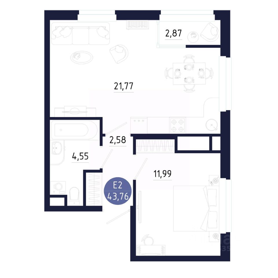Просторная кухня-гостиная, отдельная спальня, гардероб — всё на своих местах. Потолки выше обычного, окна в пол — квартира наполнена светом и выглядит ещё больше.