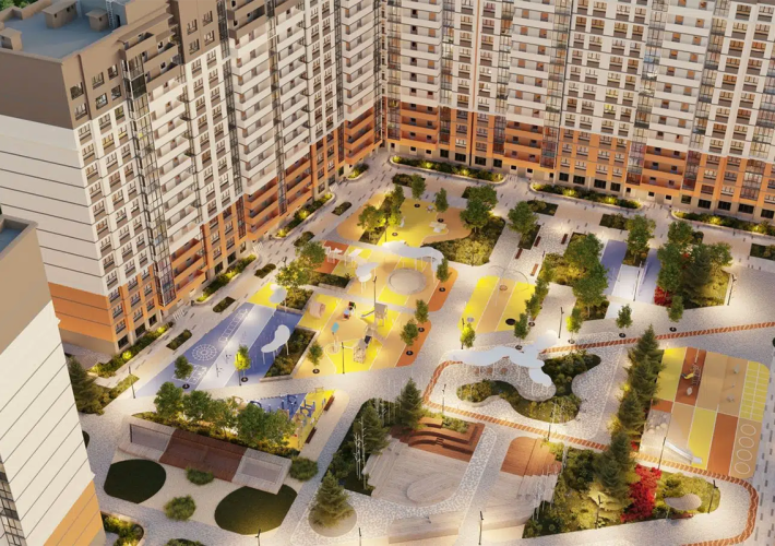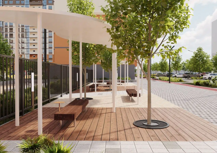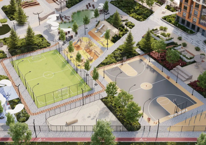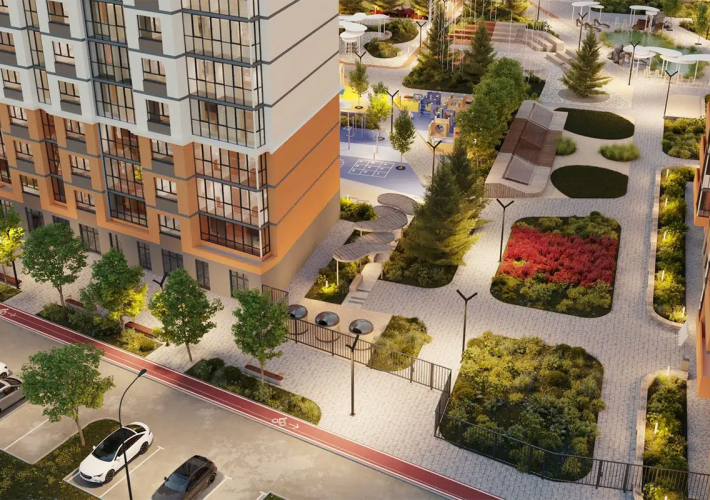 Вход в дома удобен в любое время года: пол первого этажа находится на одном уровне с тротуаром. Во дворе достаточно места для свободного передвижения с коляской, что будет особенно актуально для семей с маленькими детьми.