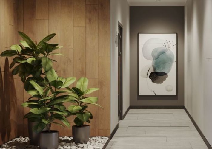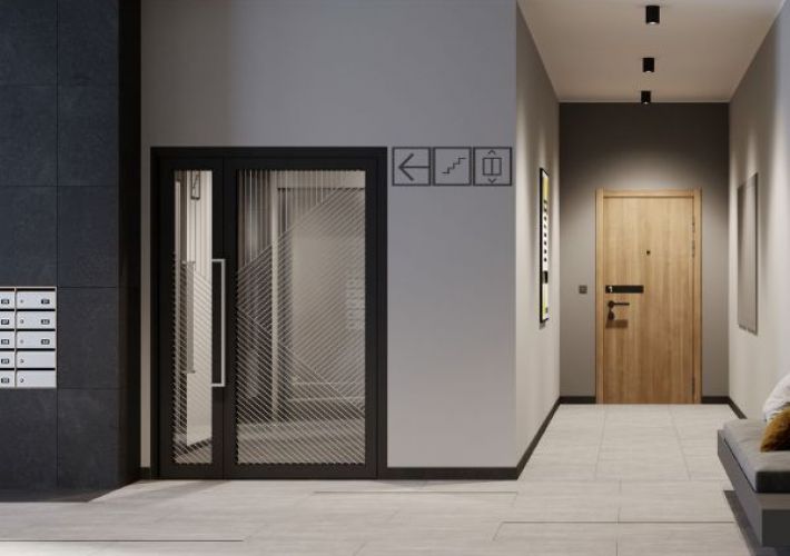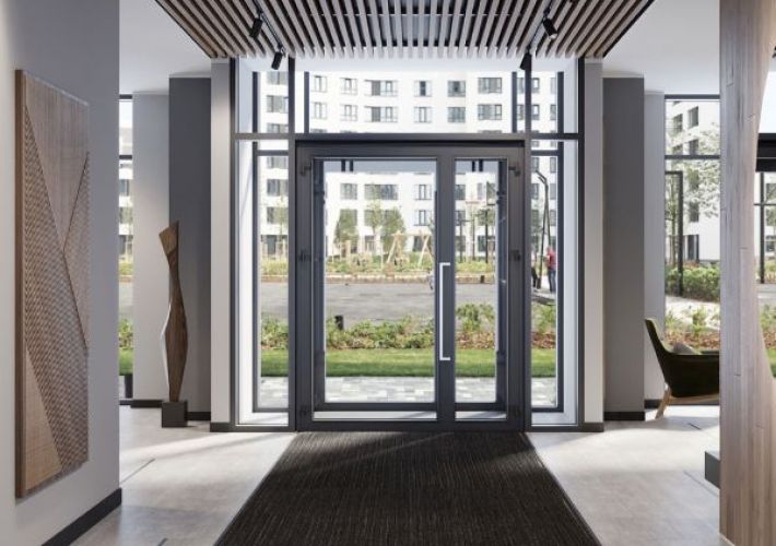 В квартале прозрачные входные группы выполнены с уровня тротуара. Выходы сквозные - с улицы и со двора. В подъездах застройщик предусмотрел колясочные и установил вместительные лифтовые кабины.