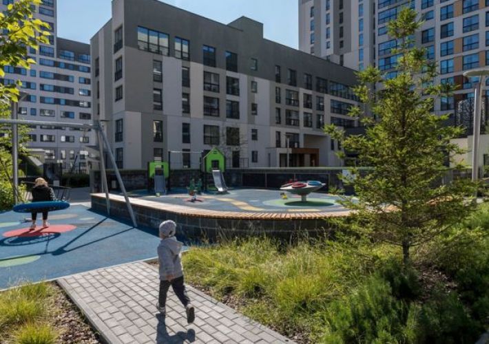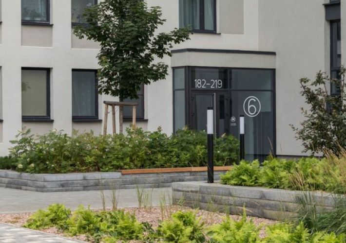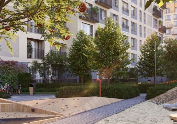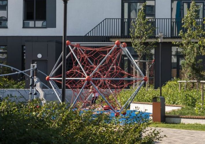 Зеленый двор вокруг домов содержит площадки для детских игр и занятий спортом, зоны отдыха. Свободный въезд машин на территорию внутреннего двора ограничен. Теплый подземный паркинг жилого комплекса вмещает 80 машин. Из паркинга предусмотрен выход к лифту.