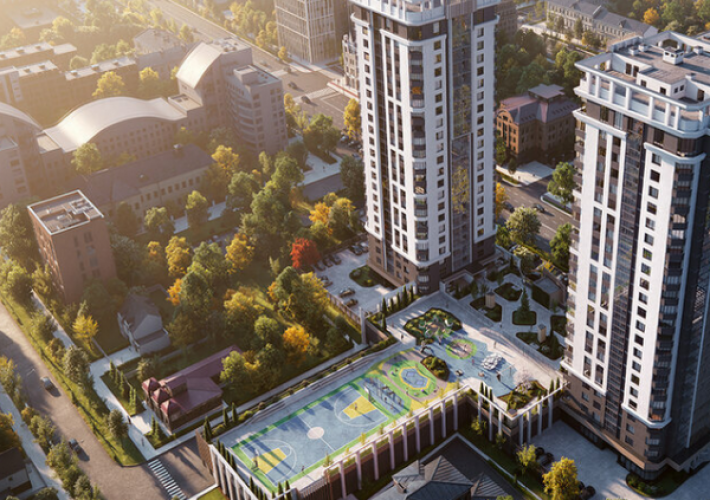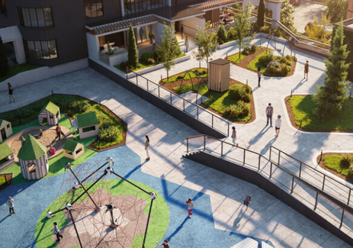 Территория комплекса будет гарантированно свободна от автомобилей, которые можно разместить на гостевом и подземном паркинге. На крыше подземной парковки расположится обособленный зеленый двор с детской площадкой, современными игровыми комплексами, зоной отдыха, workout-площадкой для взрослых и детей, полем для командных игровых видов спорта.