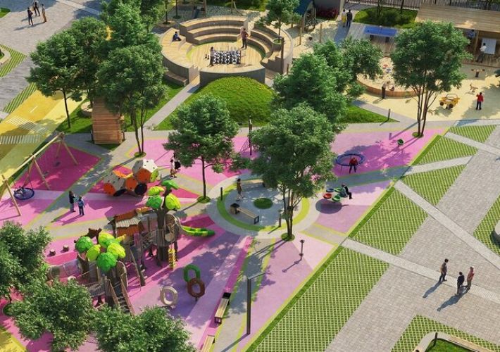 Благоустройство включает детскую площадку с мягким покрытием, спортивную площадку, амфитеатр, велодорожки, зоны отдыха с пешеходными аллеями.