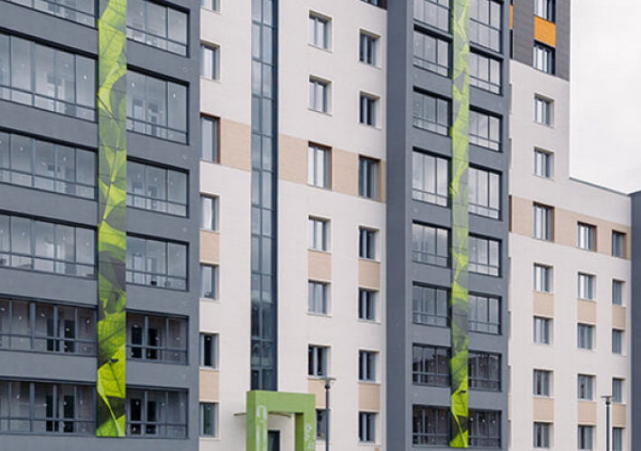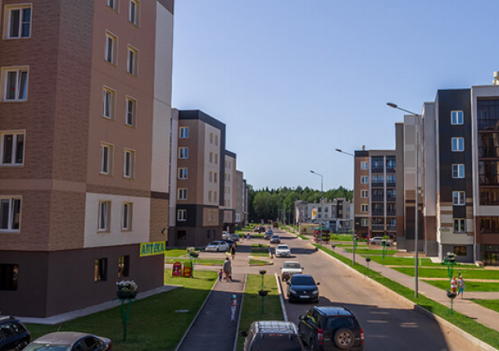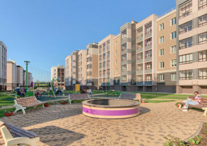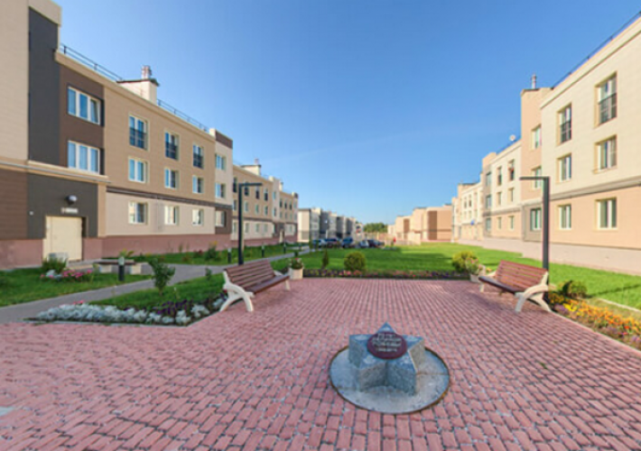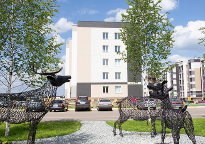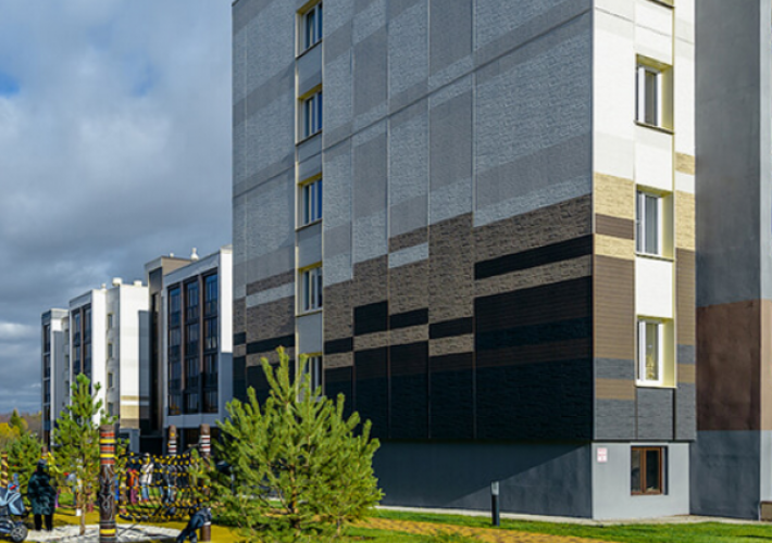 Многоэтажные кирпичные дома являются архитектурной доминантой всего района. Для отделки фасадов использованы японские фасадные панели KMEW, которые не только создают неповторимый облик, но и помогают сберегать тепло в домах.
