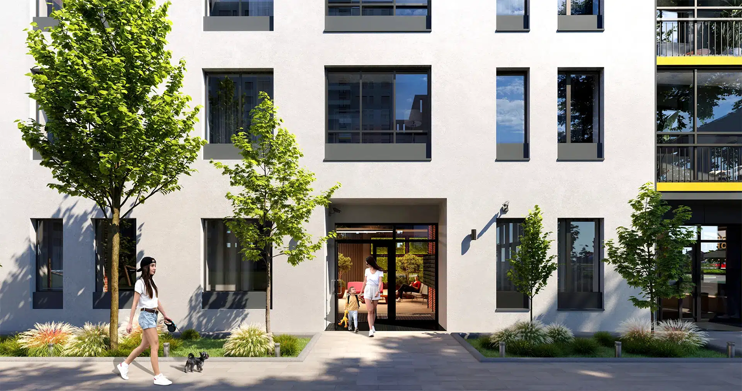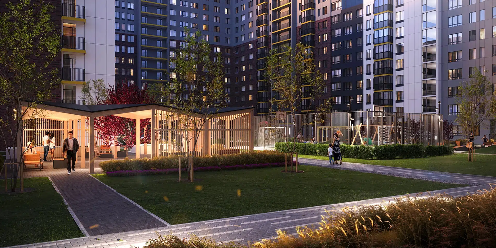 На закрытой территории комплекса Новеллы не будет машин и посторонних. Для безопасности предусмотрены камеры видеонаблюдения и пульт охраны. Во дворе появятся детские площадки для разных возрастов, зоны для отдыха и дорожки для прогулок. В холлах будет светло благодаря прозрачным входным группам, которые расположатся на уровне земли. На первых этажах спроектированы колясочные.