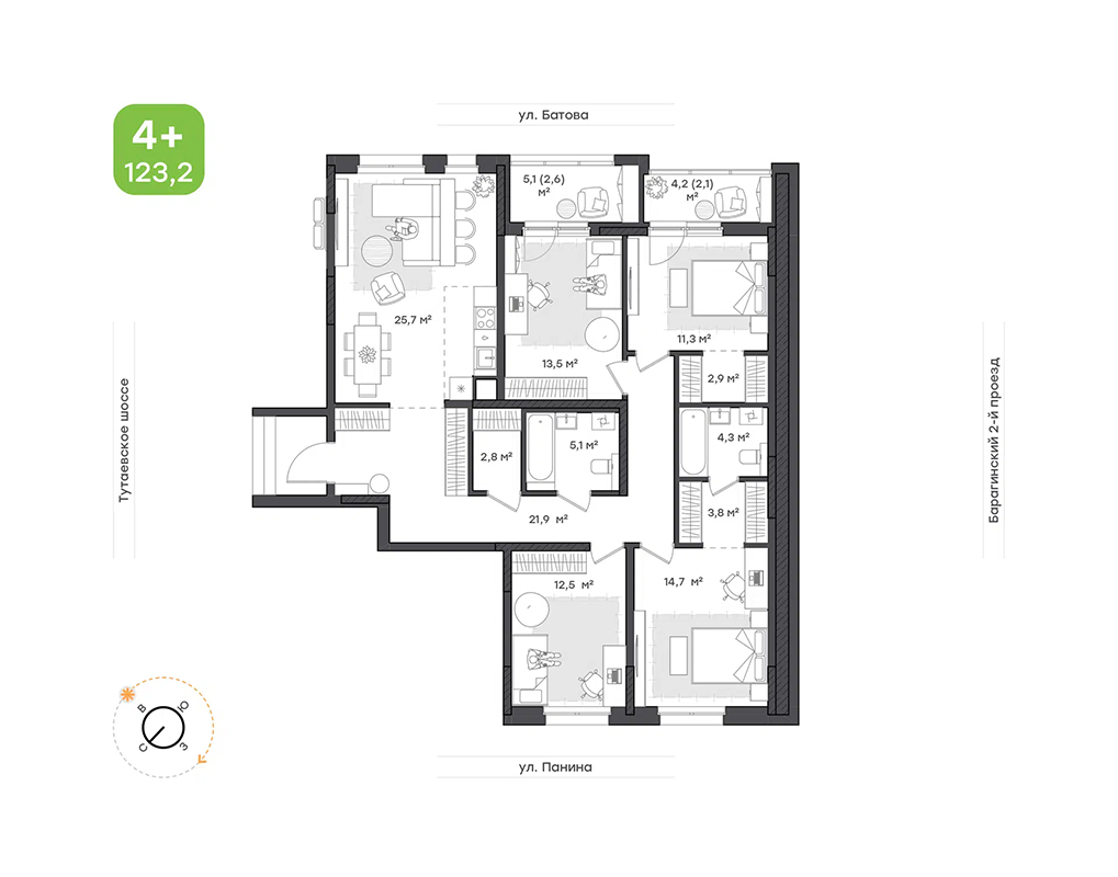 В радиусе нескольких километров есть школы и детские сады, многопрофильные клиники и стоматологии, спортивные и торговые комплексы. До многих мест можно добраться пешком за несколько минут.
